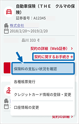 確認したい契約の「契約に関するお手続き」を押下し、「保険料の支払い状況を確認」を選択